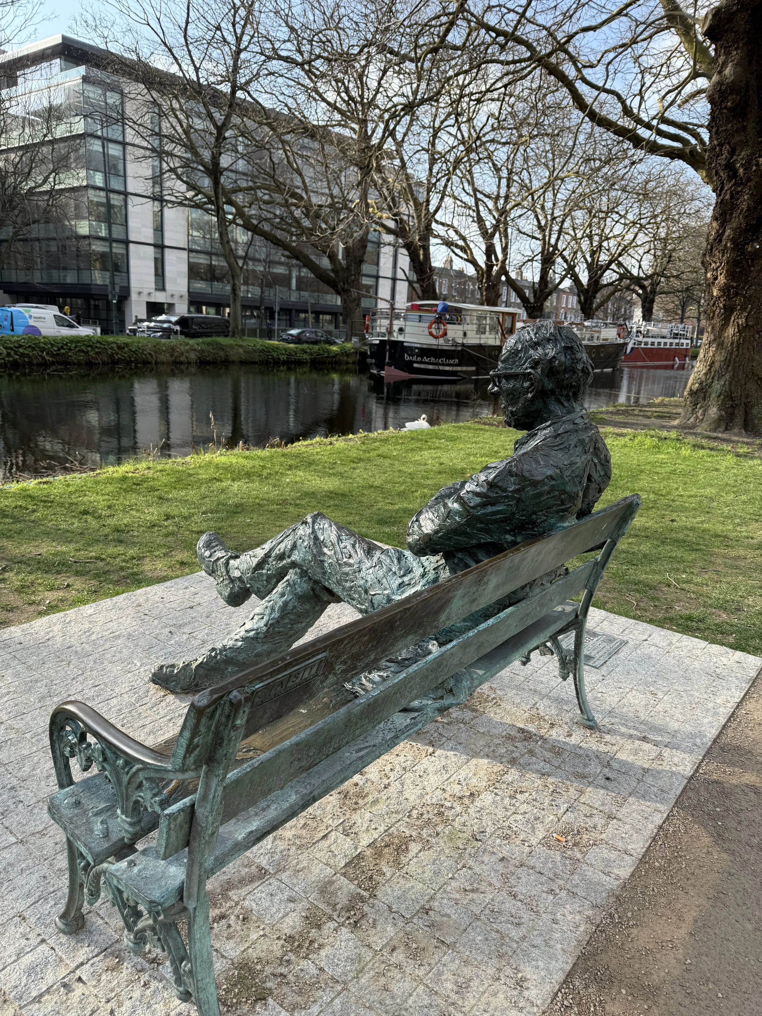 There are actually two seats dedicated to Kavanagh on the Grand Canal. The first, a simple wood and granite bench with no figure, was erected by his friends John Ryan and Denis Dwyer shortly after his death in 1968, on the south bank at the Lock Gates near Baggot Street Bridge. The John Coll statue came more than two decades later. Most visitors only know the second one.